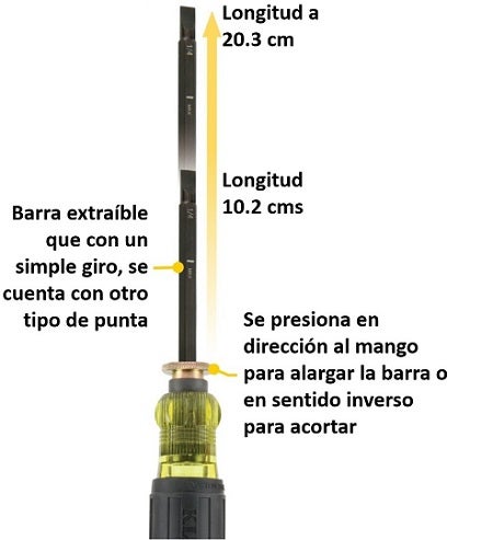 Otra de las innovaciones de Klein, son los desarmadores de longitud ajustable, cuentan con dos tipos de puntas, además su barra es extraíble y graduable. Gracias a ello permite ingresar a lugares recónditos. Si desea conocer más sobre este producto, le invitamos a ver el video que habla de ello dando clic aquí.
