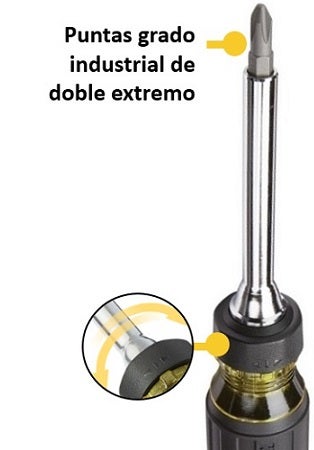 Un dato adicional, es que la barra en posición corta funge como desarmador de caja y en posición larga como desarmador de puntas. (mod. 32900 incluye: 3 dados girados que equivalen a 6 medidas de caja y 6 puntas almacenadas en el mango).