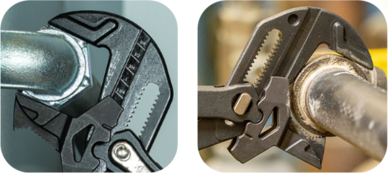 Pasemos a revisar otro tipo de herramienta que es la llave 2 en 1 (Inglesa y Perico de 10") que reúne múltiples beneficios gracias a que se ajusta de forma rápida con base al trabajo a realizar, resulta útil para tuberías u objetos redondos al ocupar su mordaza moleteada en forma “V”. Este diseño exclusivo, provee sujeción adicional y ajuste único dejando atrás los molestos resbalones de la pieza que se esté trabajando al apretar o aflojar. Cuando se invierte la posición, es posible trabajar con su parte plana bastante eficiente para tuercas hexagonales o cuadradas tal como se aprecia en la siguiente imagen: