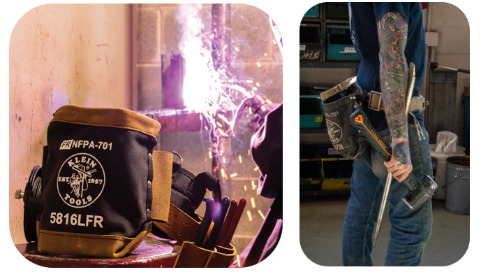 La bolsa está fabricada en cuero resistente y lona ignífuga #4 permitiendo al profesional trabajar cerca de zonas con riesgo de ignición, su diseño tipo bisagra a presión mantiene la bolsa abierta (para facilitar el acceso) o cerrada (para asegurar las herramientas).