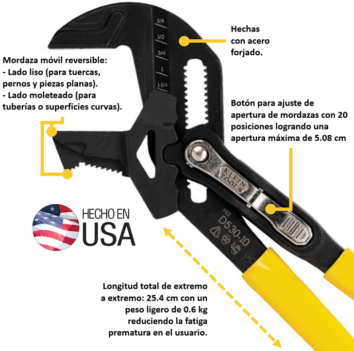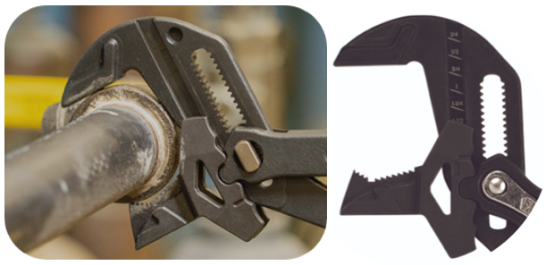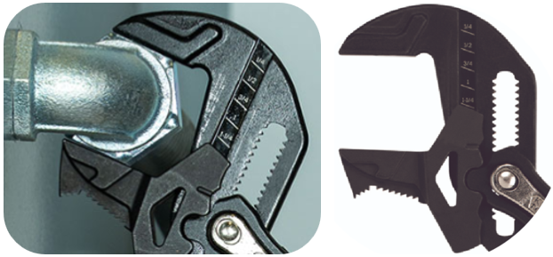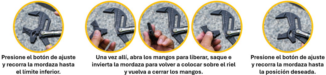 Esta imagen nos habla de otros beneficios, como por ejemplo que el mango es de gran tamaño lo que posibilita al usuario de un efecto palanca y ayudándole a que, con poco esfuerzo, la carga o fuerza aumente sobre el objeto que se esté trabajando. En cuanto a su mordaza hablemos de lo fácil que es hacerla reversible, solo siga estos sencillos pasos para que en segundos amplie sus posibilidades: