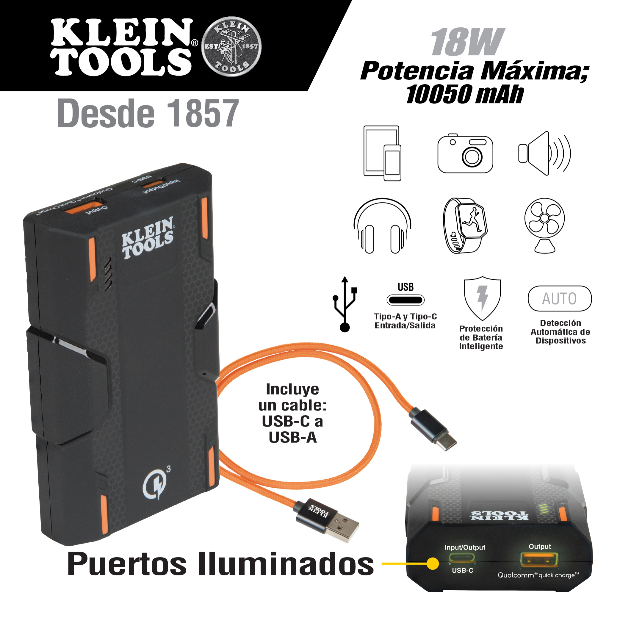 La KTB1 de Klein Tools es una batería portátil (cargador) de iones de litio diseñada para cargar dispositivos móviles comunes como teléfonos celulares, tabletas, baterías portátiles, audífonos, luces frontales y otros pequeños dispositivos USB. La KTB1 está equipada con la tecnología Quick Charge™ de Qualcomm®, proporcionando una carga hasta 75 % más rápida que la convencional. La KTB1 cuenta con un diseño resistente y compacto con una carcasa resistente a impactos para soportar el uso diario profesional y activo.