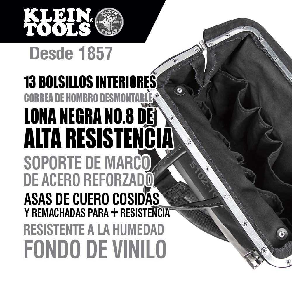 La maleta de lona de lujo para herramientas de Klein Tools está fabricada completamente en negro y tiene un diseño clásico. Está confeccionada en lona negra n.º 8 de alta resistencia con el icónico logotipo del liniero en color negro. Posee dos correas de cuero con hebillas para proporcionar un cierre seguro, además asas de cuero cosidas y remachadas para ofrecer comodidad y resistencia. Organice las herramientas con 13 bolsillos interiores. Correa de hombro desmontable para lograr un ajuste cómodo.