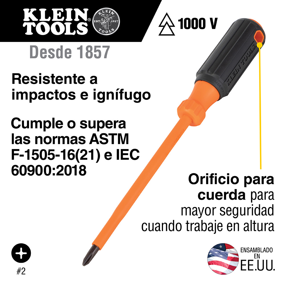 Los desarmadores con aislamiento de Klein Tools cuentan con un revestimiento de color naranja brillante con aislamiento ignífugo y resistente a los impactos para proteger contra los choques eléctricos. Estas herramientas superan las normas ASTM F1505 para herramientas con aislamiento y están marcadas claramente con el símbolo oficial de voltaje nominal de 1000 V. El orificio para cuerda en el mango proporciona mayor seguridad cuando trabaje en altura. Barras redondas disponibles en 4'' y 6'' con una variedad de puntas.