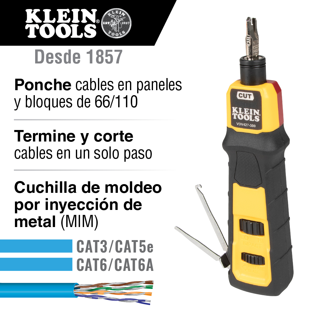 - Herramienta ponchadora que termina y corta cables CAT3, CAT5e y CAT6/6A en un solo paso