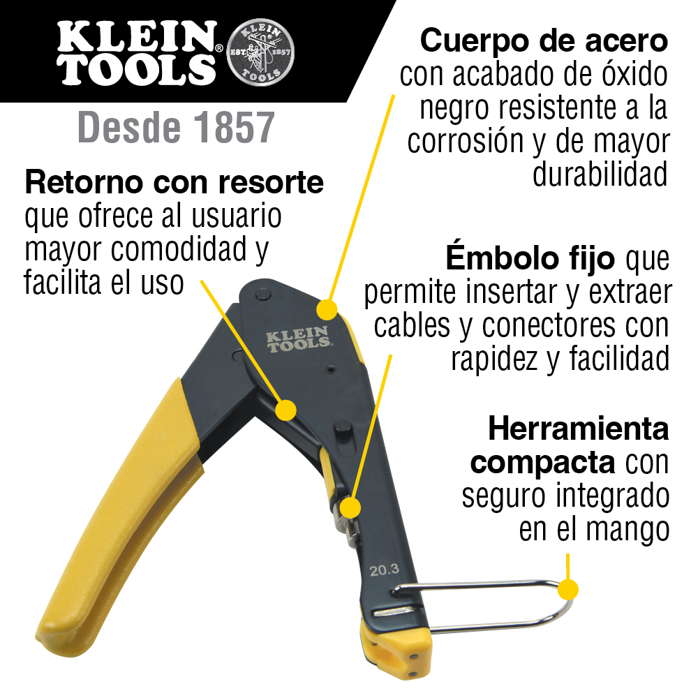 - Incluye un cortador multicable, un pelacables radial, una ponchadora, conectores universales y un estuche con cierre relámpago para el almacenamiento