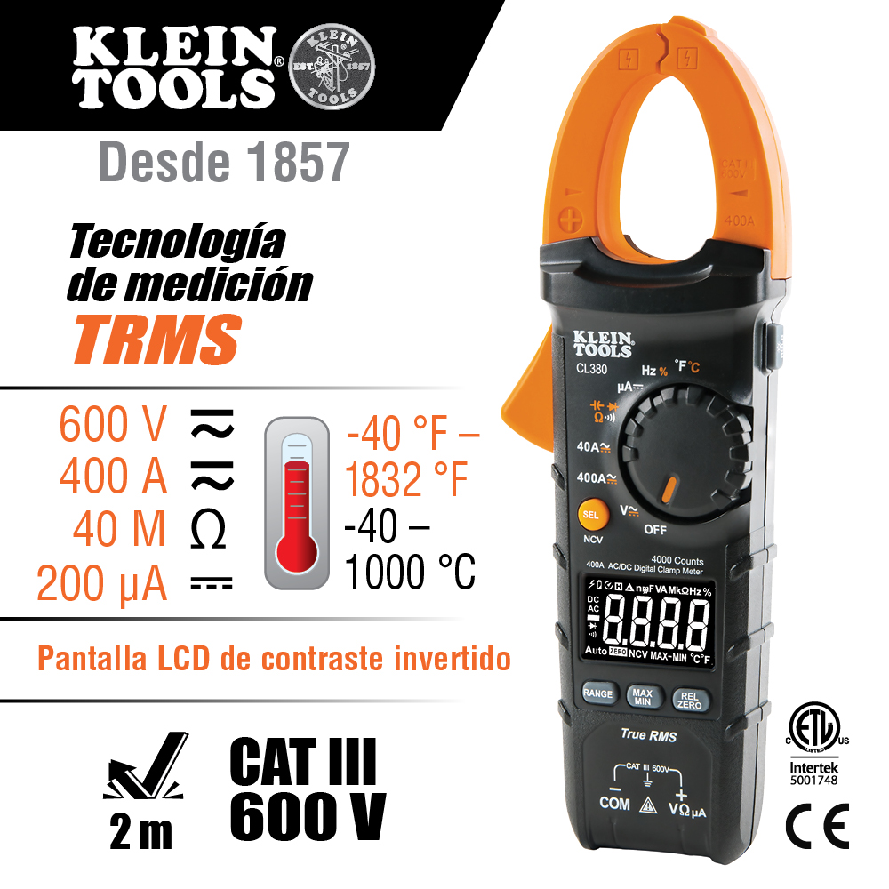 El probador eléctrico CL380 de Klein Tools es un multímetro digital de gancho de rango automático con media cuadrática real (TRMS). Mide corriente CA/DC con las pinzas, voltaje CA/CD, microamperios CD, resistencia, continuidad, frecuencia, capacitancia y diodos con los cables de prueba y temperatura con un termopar. Incluye un probador de voltaje sin contacto integrado en la pinza, y cuenta con una pantalla LCD de alta visibilidad y contraste invertido que optimiza la visualización en entornos oscuros o brillantes.