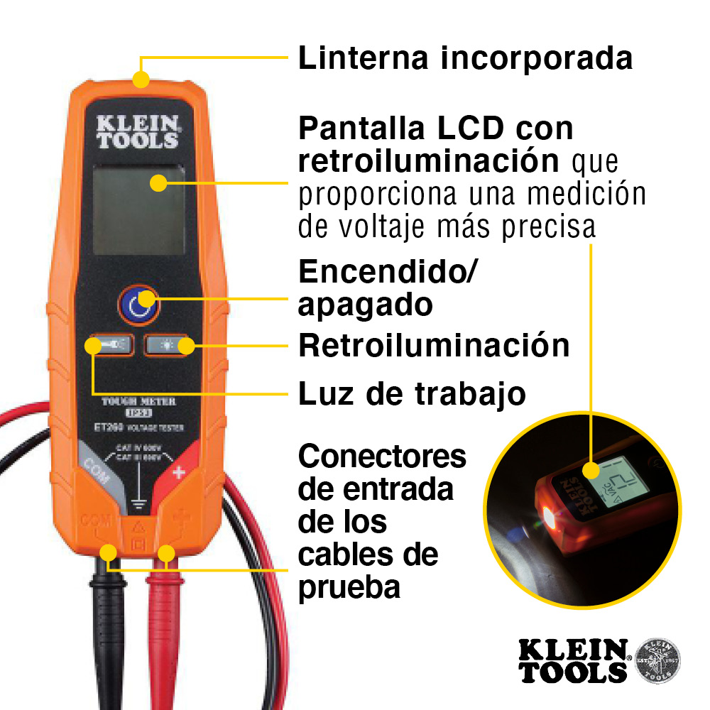 Klein Tools ET260 es un probador de voltaje y continuidad digital en estado sólido. Mide voltaje CA/CD de hasta 690 V y prueba continuidad. El probador incluye retroiluminación y linterna incorporada para trabajos en ambientes poco iluminados.