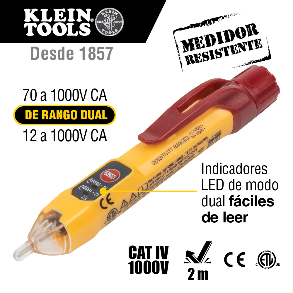 - Probador de voltaje sin contacto con capacidades de rango dual que permite que el probador detecte de 12 a 1000 V CA o de 70 a 1000 V CA para una amplia variedad de aplicaciones de bajo voltaje o de voltaje estándar