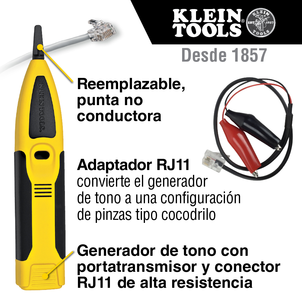 - Incluye adaptador RJ11 para convertir el generador de tono a una configuración de pinzas tipo cocodrilo